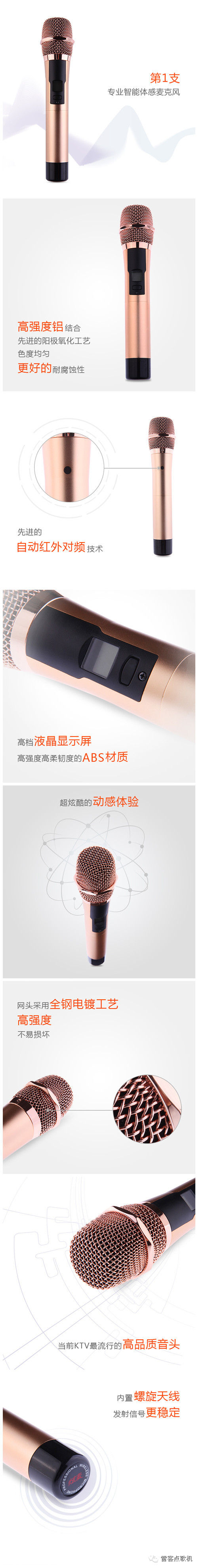 第一支智能遥控无线麦克风,它可以实现在触摸屏上的很多功能:甩一甩切歌,划一划控制音量,摸一摸原唱伴唱重唱……超炫酷的动感体验!